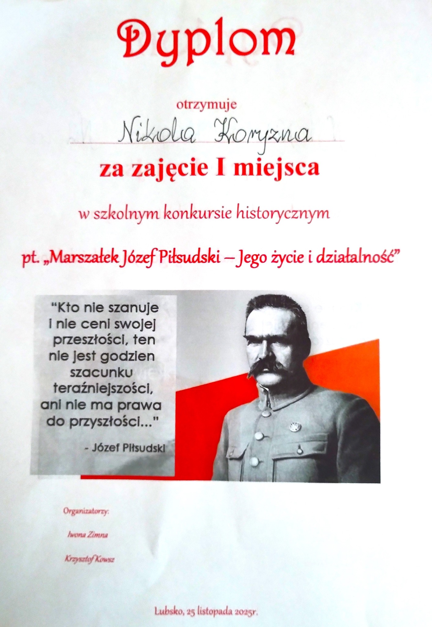 We wtorek 25.11.2025 roku w Zespole SzkóÅ‚ Technicznych w Lubsku odbyÅ‚ siÄ™ Szkolny Konkurs Historyczny pt. „MarszaÅ‚ek Józef PiÅ‚sudski - Jego życie i dziaÅ‚alność" zorganizowany z okazji 90 - rocznicy Å›mierci. W konkursie wzięło udziaÅ‚ 31 uczniów, zwyciÄ™zcÄ… konkursu zostaÅ‚a Nikola Koryzna klasa III TLA, II miejsce zajÄ…Å‚ RadosÅ‚aw Kulczyk klasa I TL, na najniższym miejscu podium uplasowaÅ‚a siÄ™ Nadia Bobryk - klasa III TLA. Wszystkim uczniom dziÄ™kujemy za udziaÅ‚ w konkursie.